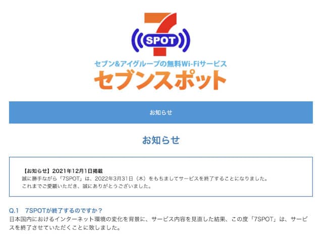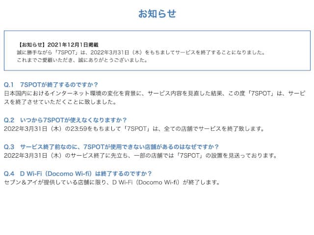 セブン-イレブンは自社のWi-Fiであるセブンスポットとドコモが提供するWi-Fiサービスのd Wi-Fiの提供を終了しました。